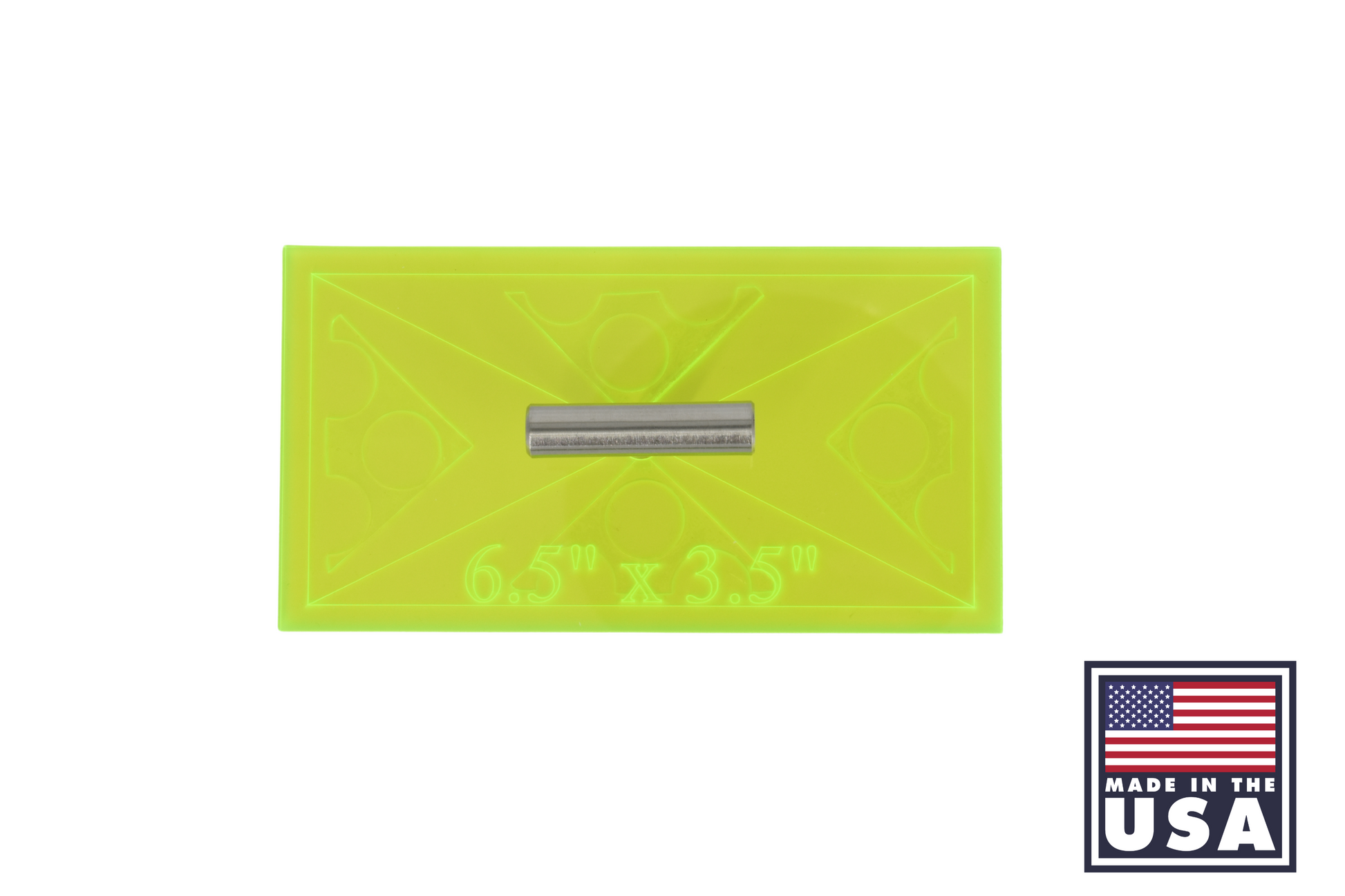 As its name suggests, the Half-Rectangle Trim-Lock is meant to be used to cut half-rectangle blocks. This particular model is 6.5" x 3.5" and made with 1/4" thick acrylic and results in a finished block of 6" x 3". The magic happens when you apply pressure to the handle, which engages the grippy material on the base of the Half-Rectangle Trim-Lock on your fabric, keeping your fabric in place so you can cut, and spin, your fabric without having to readjust your template for every cut.